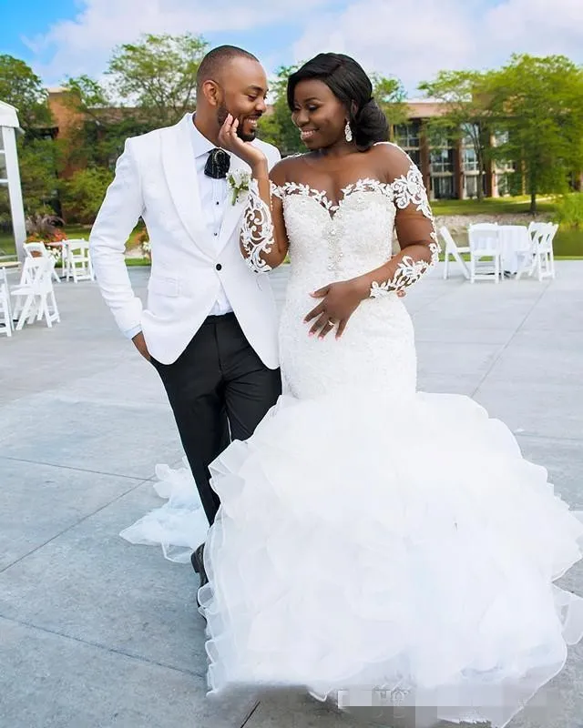 Plus Size African Plus Mermaid Wedding Dress With Long Sleeves Cathedral Train Tiered Organza Lace Applique And Jewel Neckline Vestido De Novia From Suelee Dress 159 36 Dhgate Com